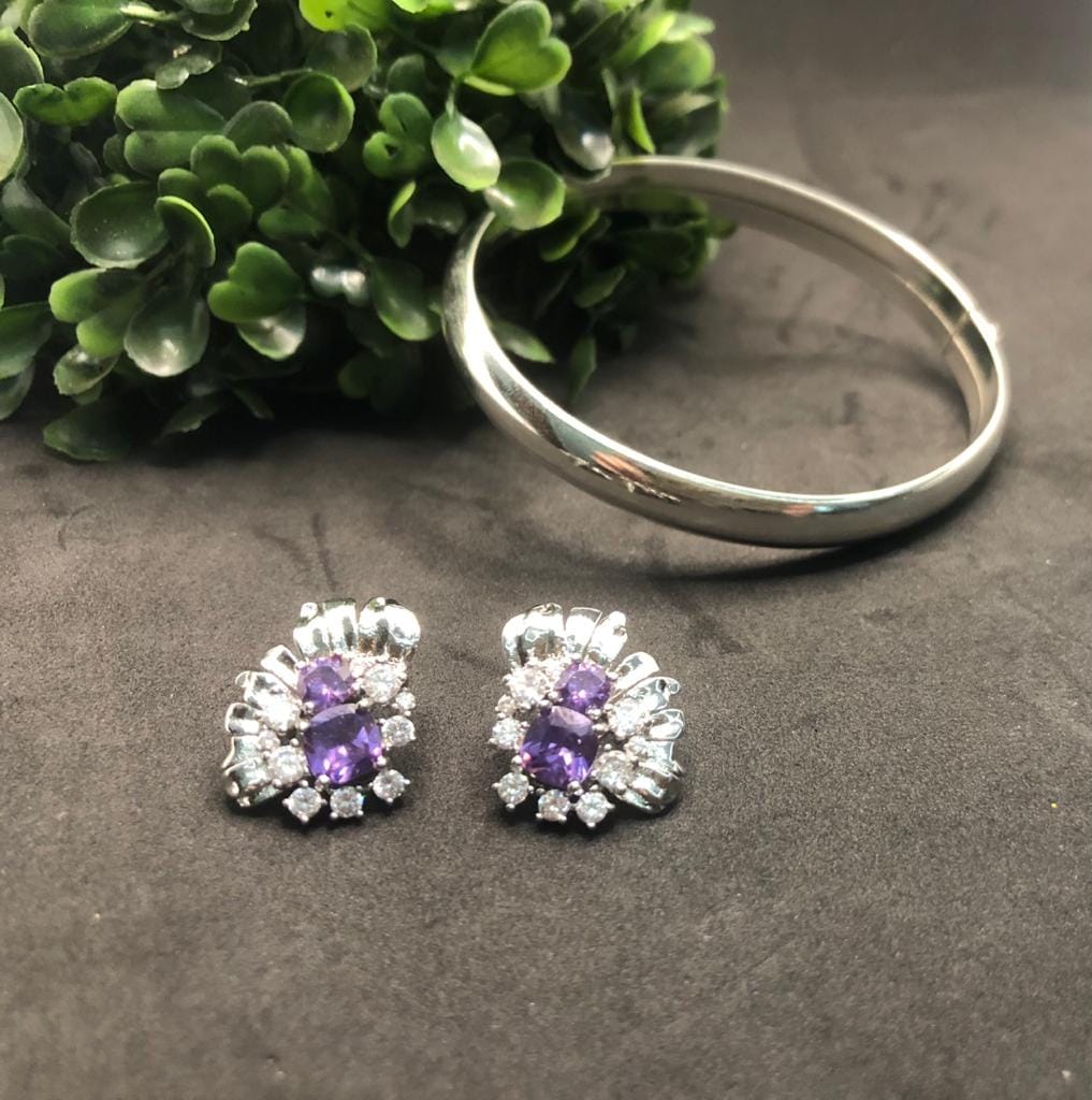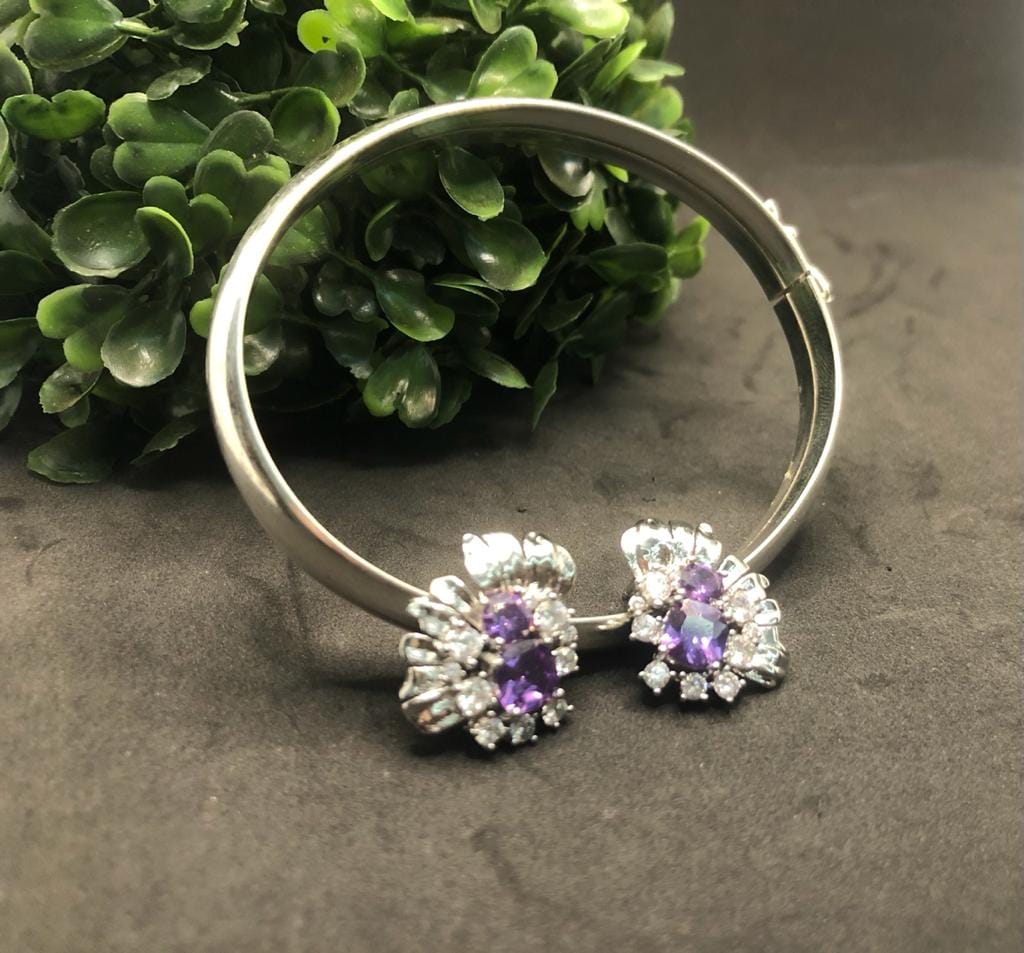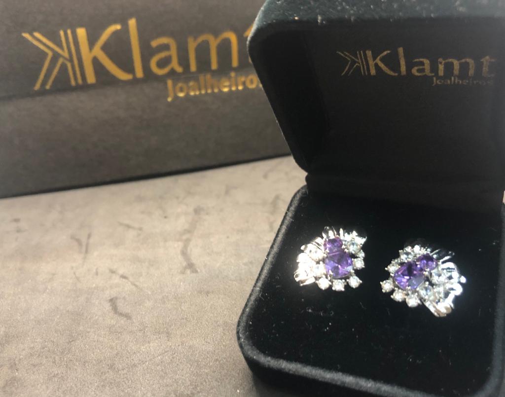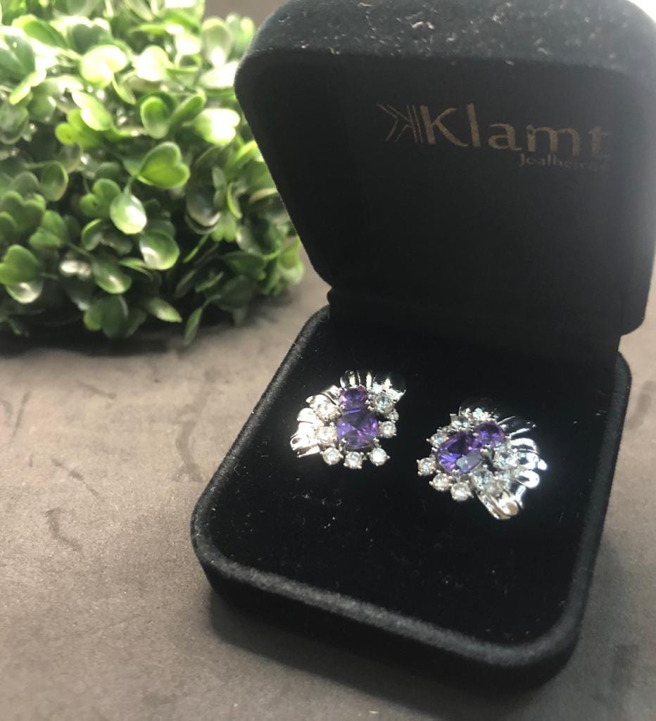 Pedras: Zirconias Quadradas Brancas e Cristais cor de Ametista redondos, um médio e um grande.