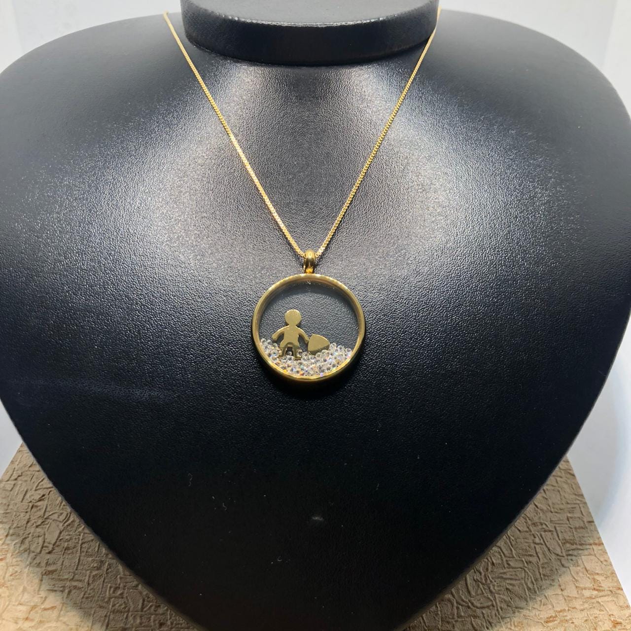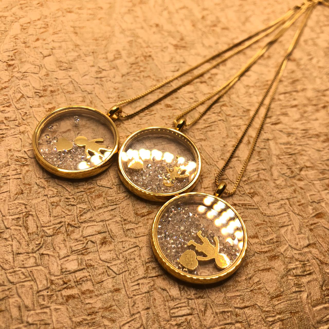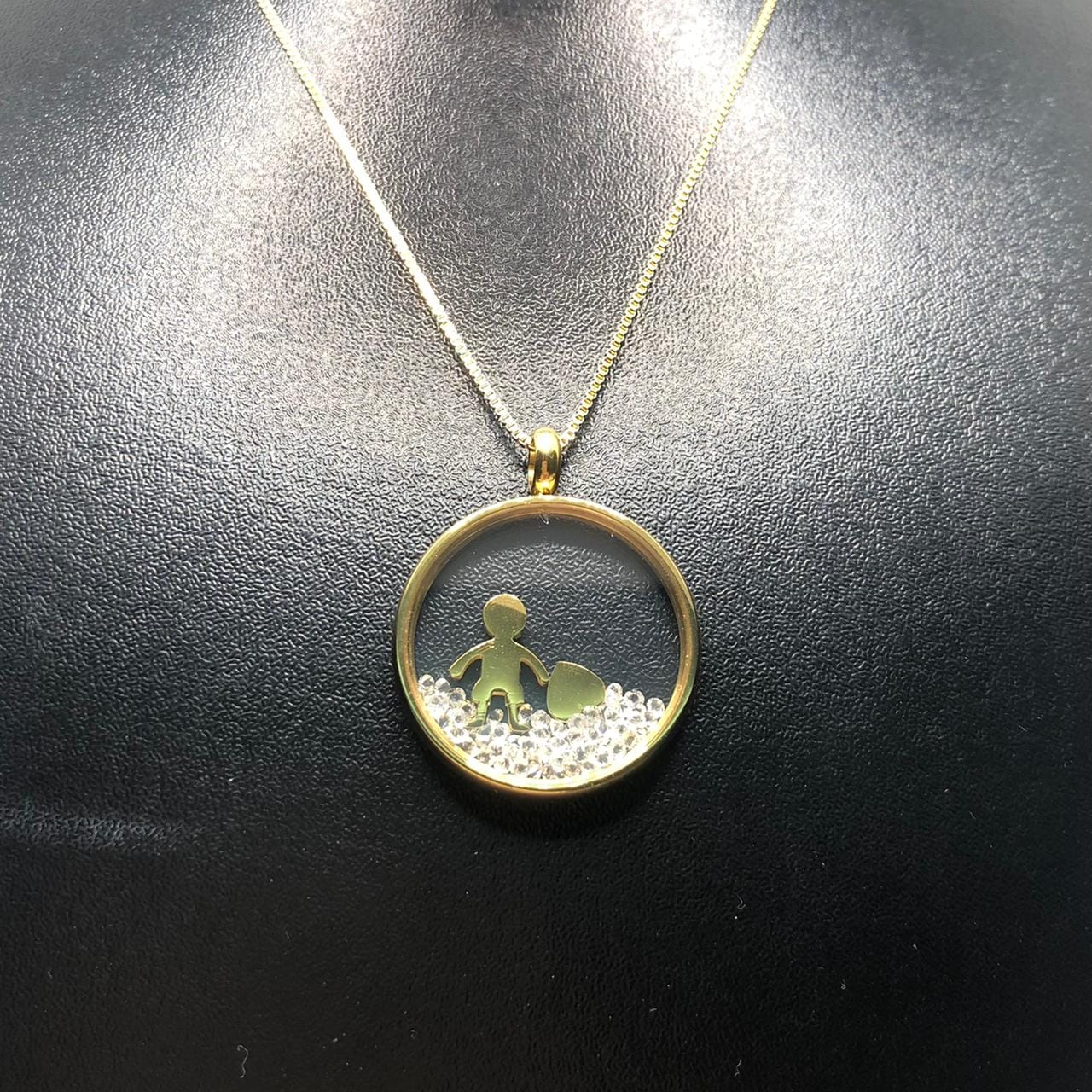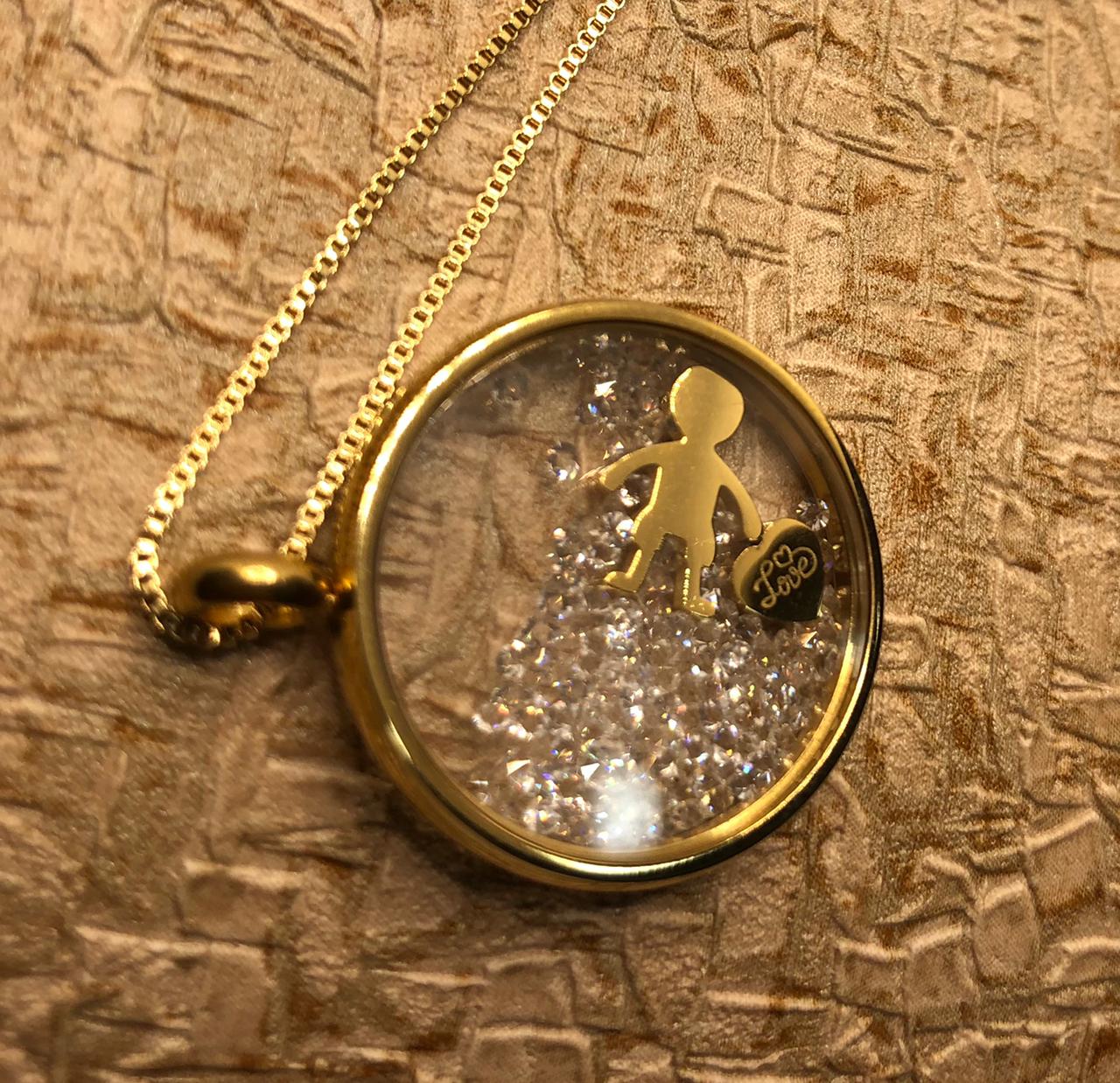 Pedras: Circulo Transparente e borda folheada a ouro 18K – metal amarelo -, com pingentes dentro: menino e coração gravado a escrita “Love”