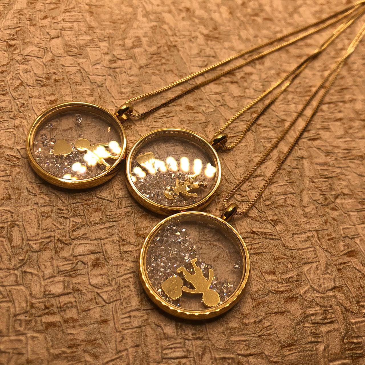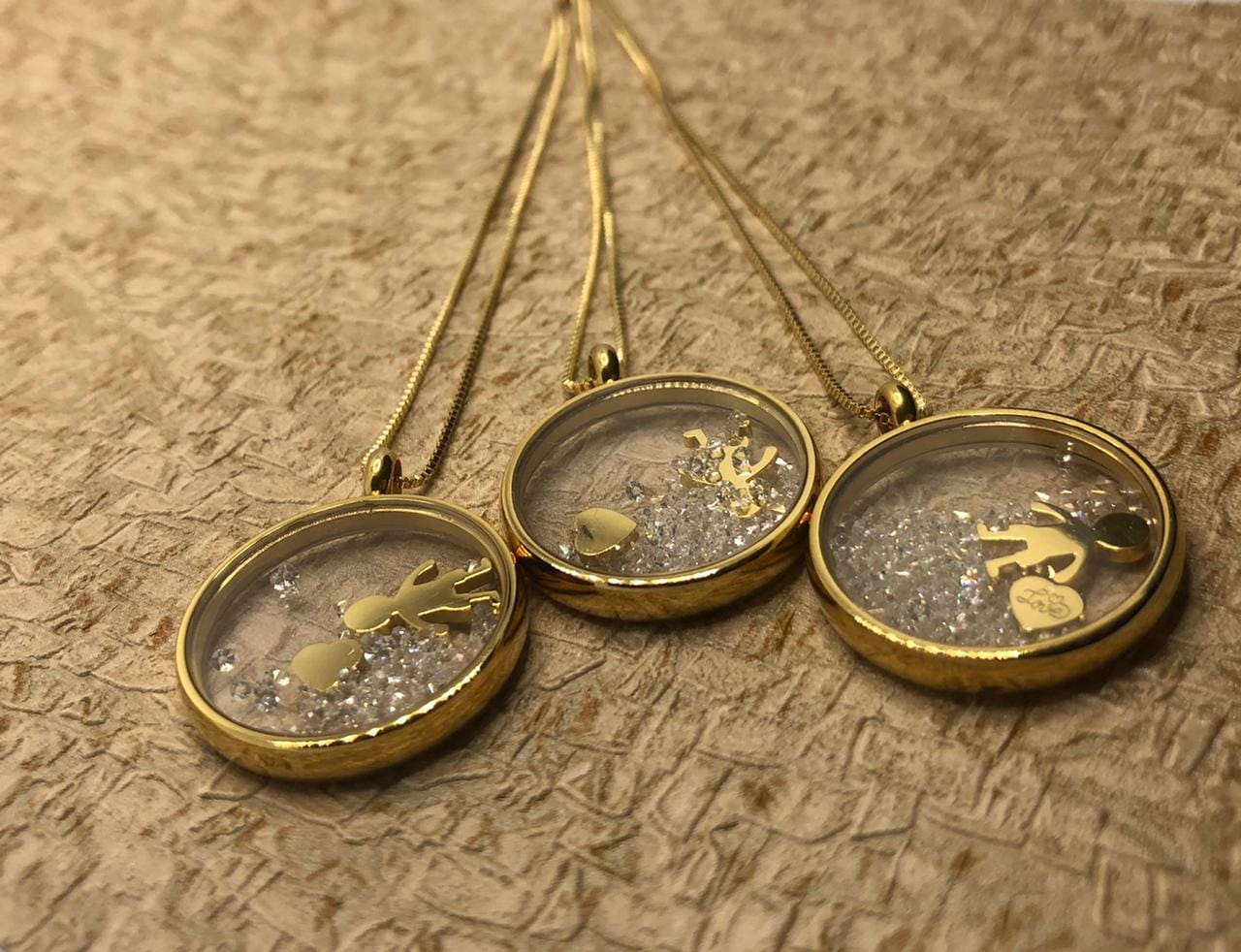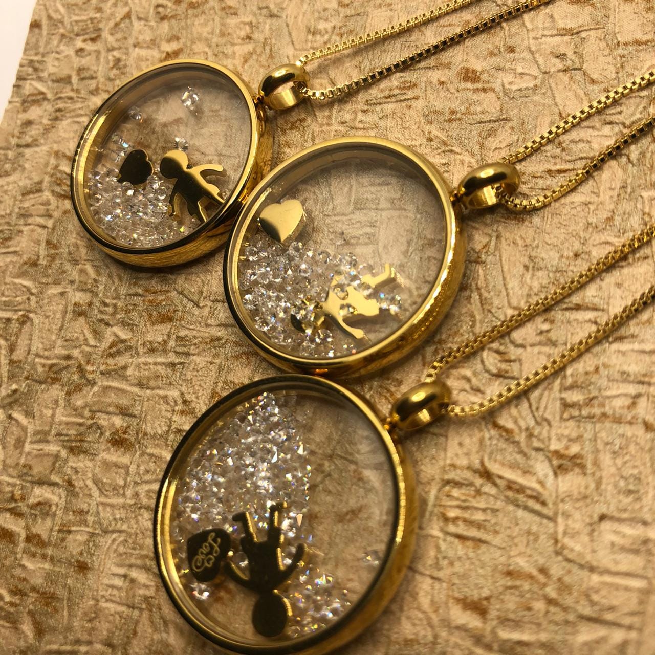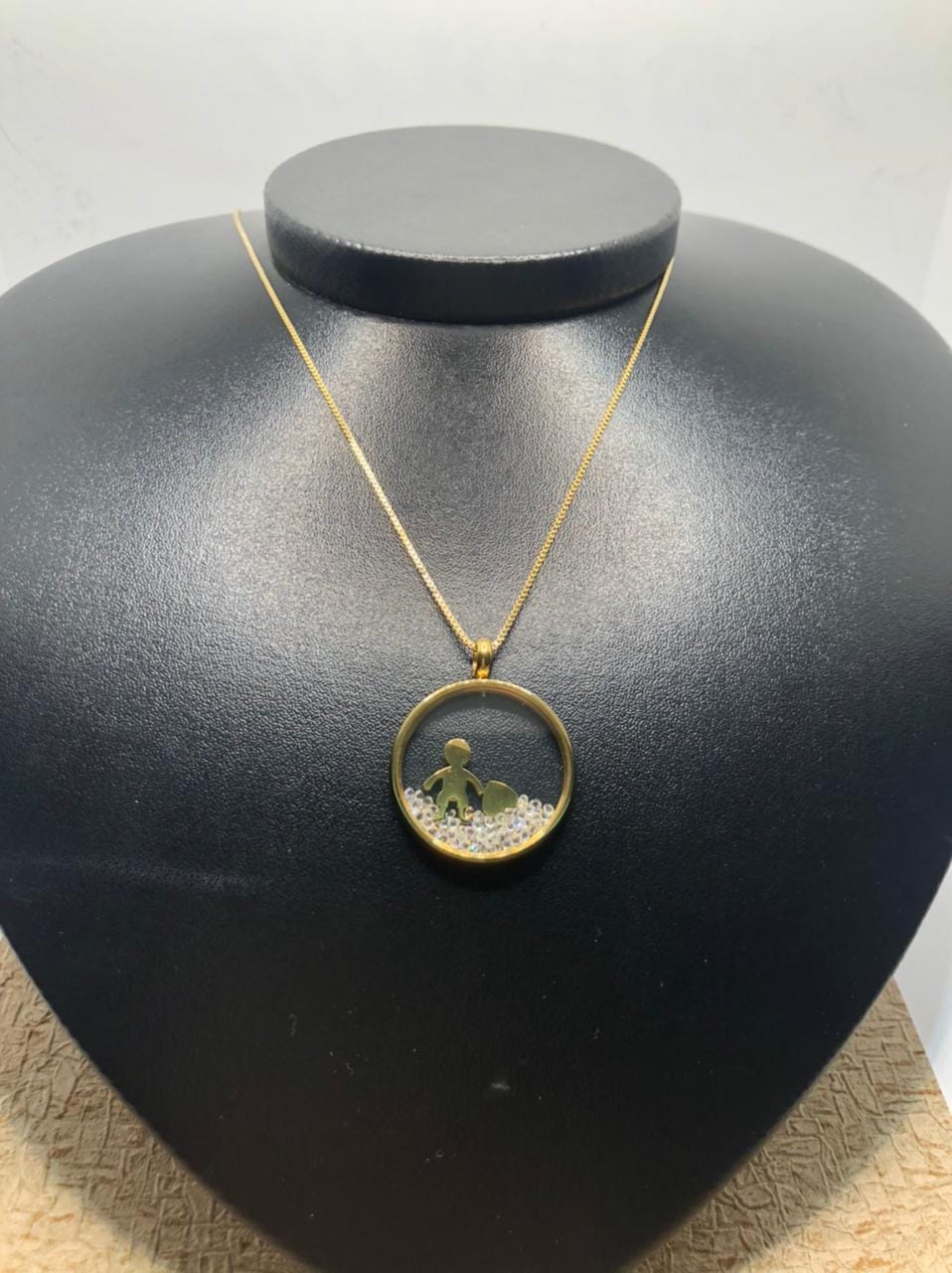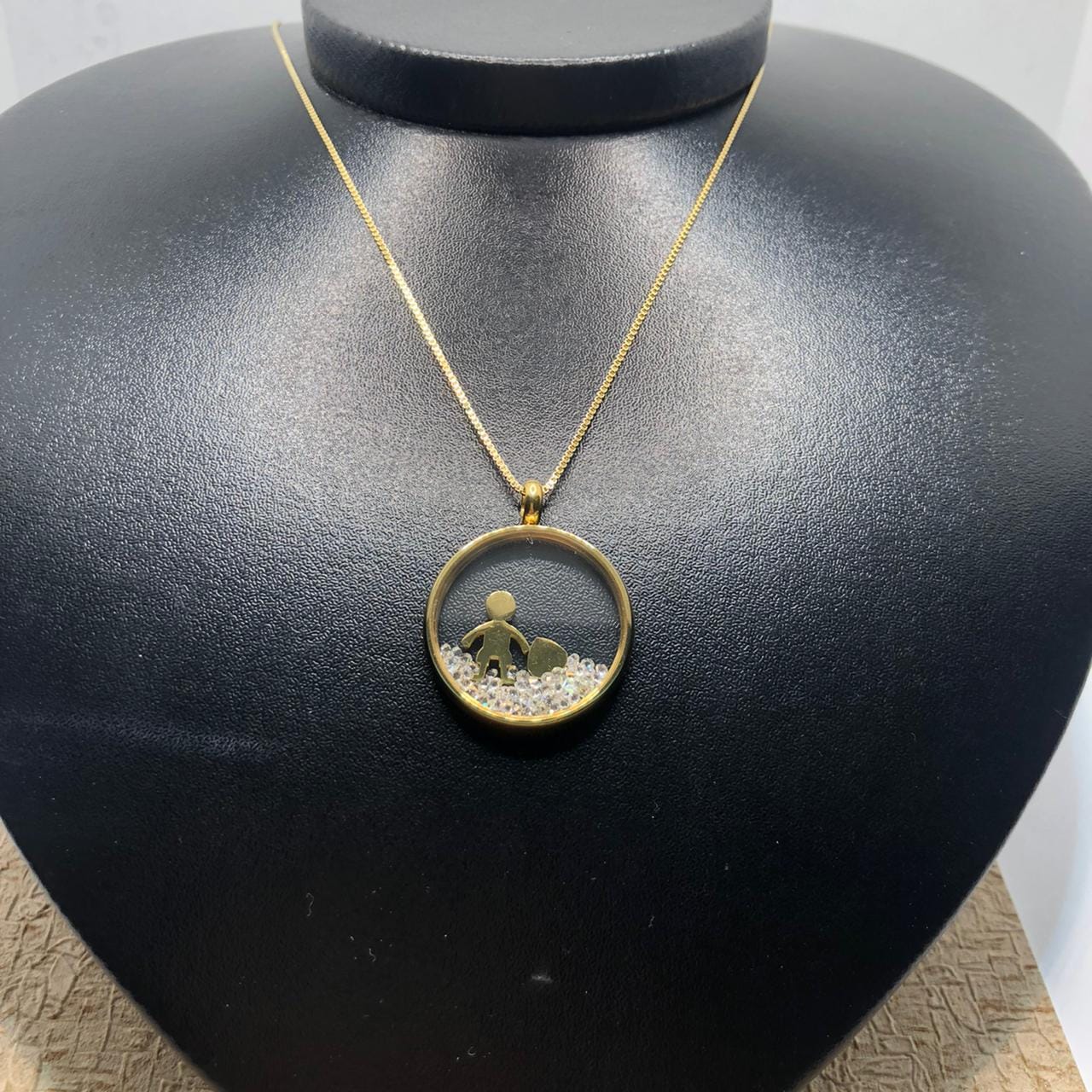 Pedras: Circulo Transparente e borda folheada a ouro 18K – metal amarelo -, com pingentes dentro: menino e coração gravado a escrita “Love”