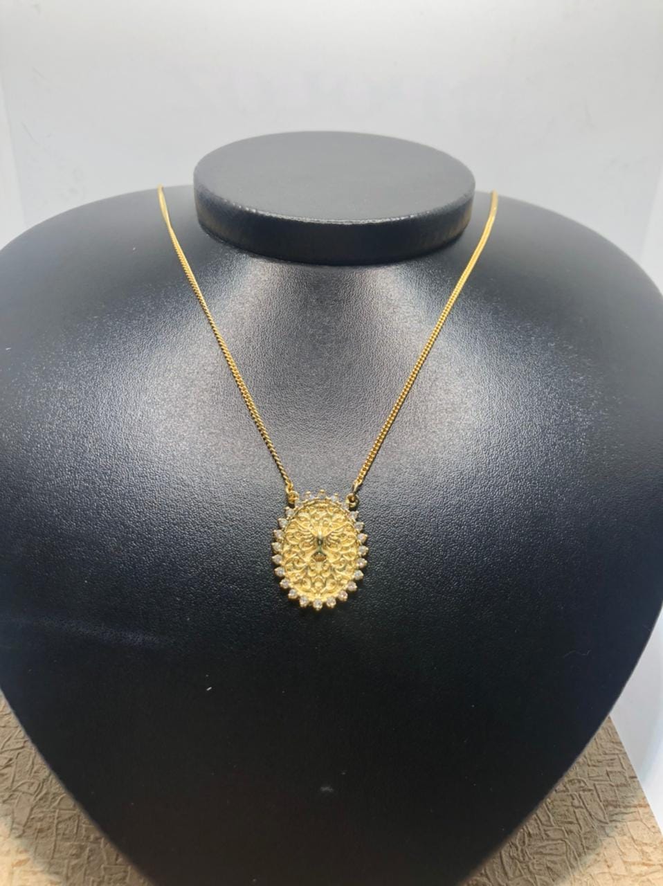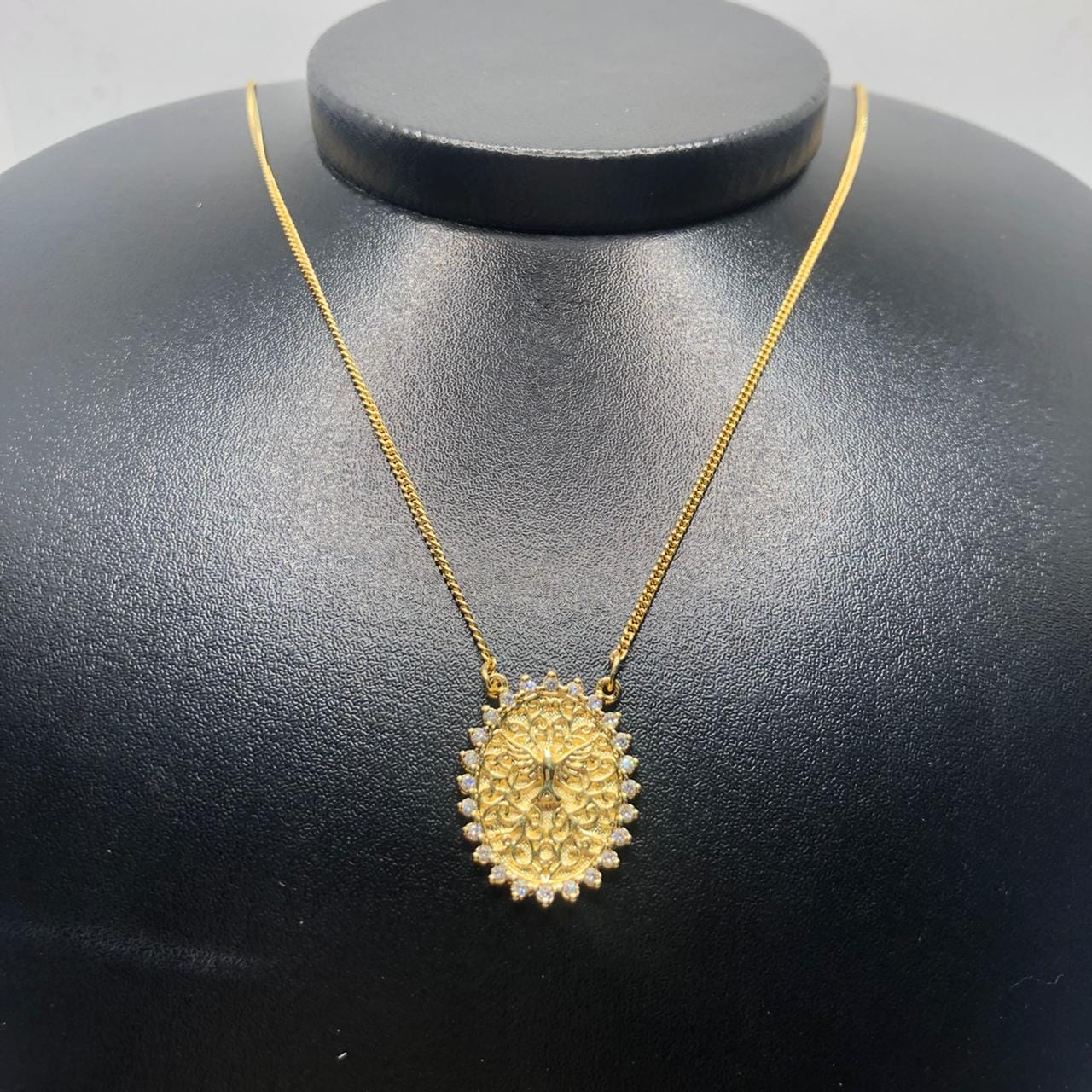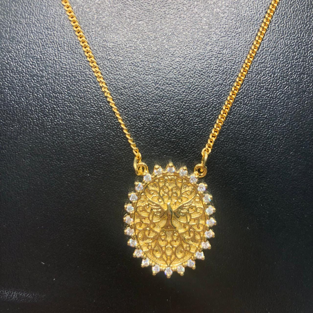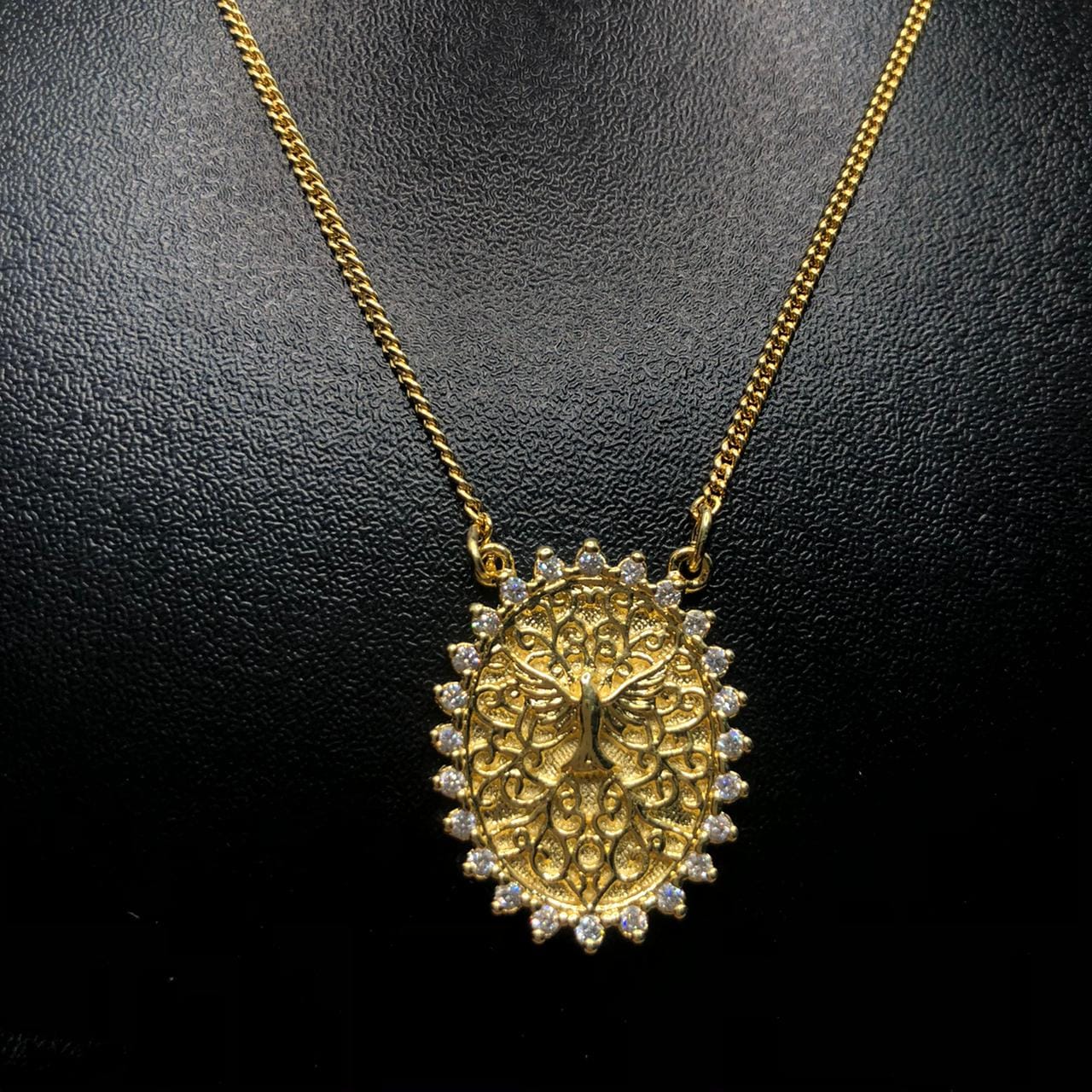 Pingente: Chapa Oval Folheada a Ouro ( comprimento: 2,5 cm – Largura 1,8 cm – Espessura 2 mm), gravada com a imagem do Espirito Santo e nas bordas zirconias redondas