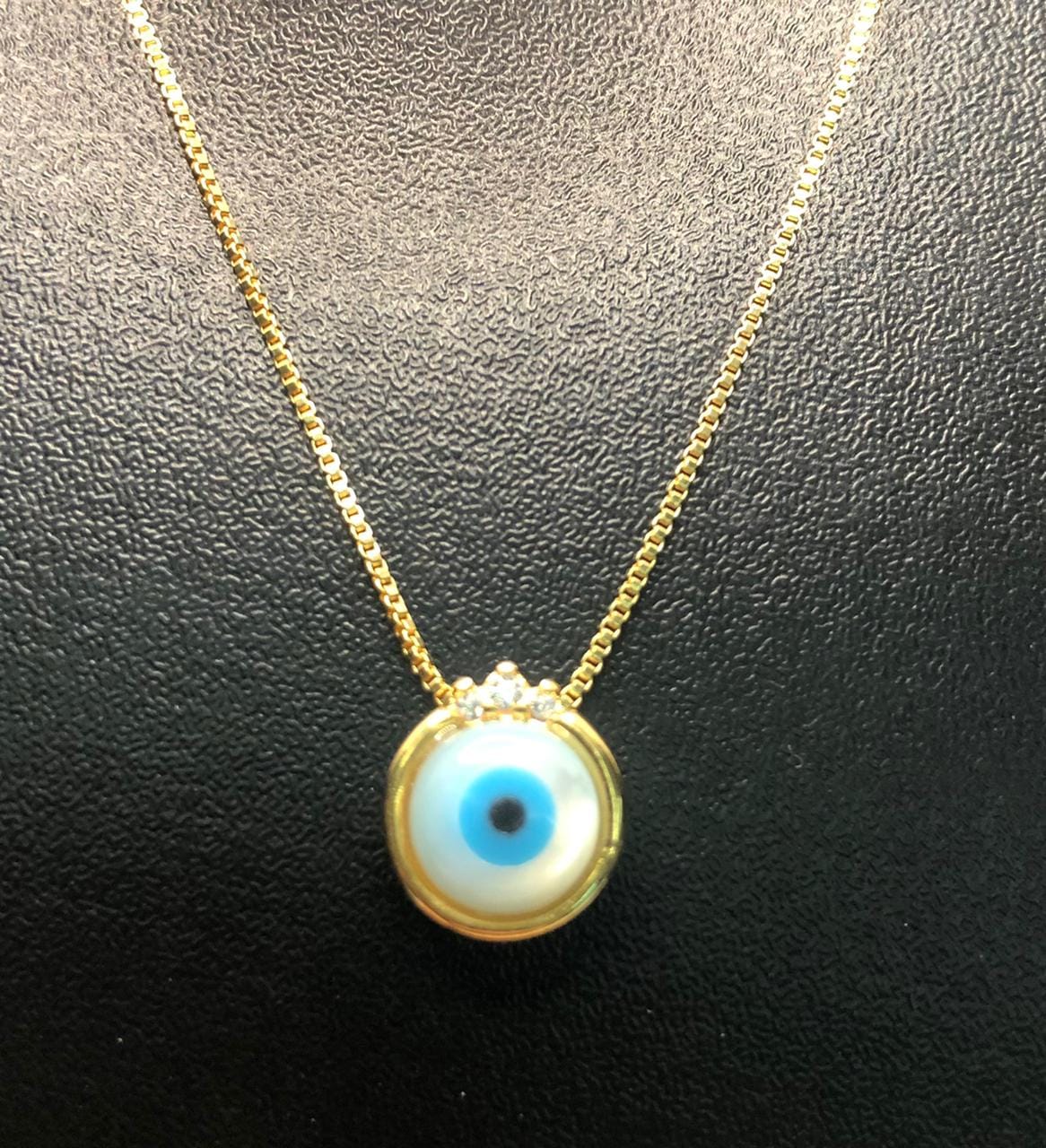 Pingente: Circulo folheado a Ouro 18K, com uma pedra de olho grego e 3 Zirconias ovais logo acima.